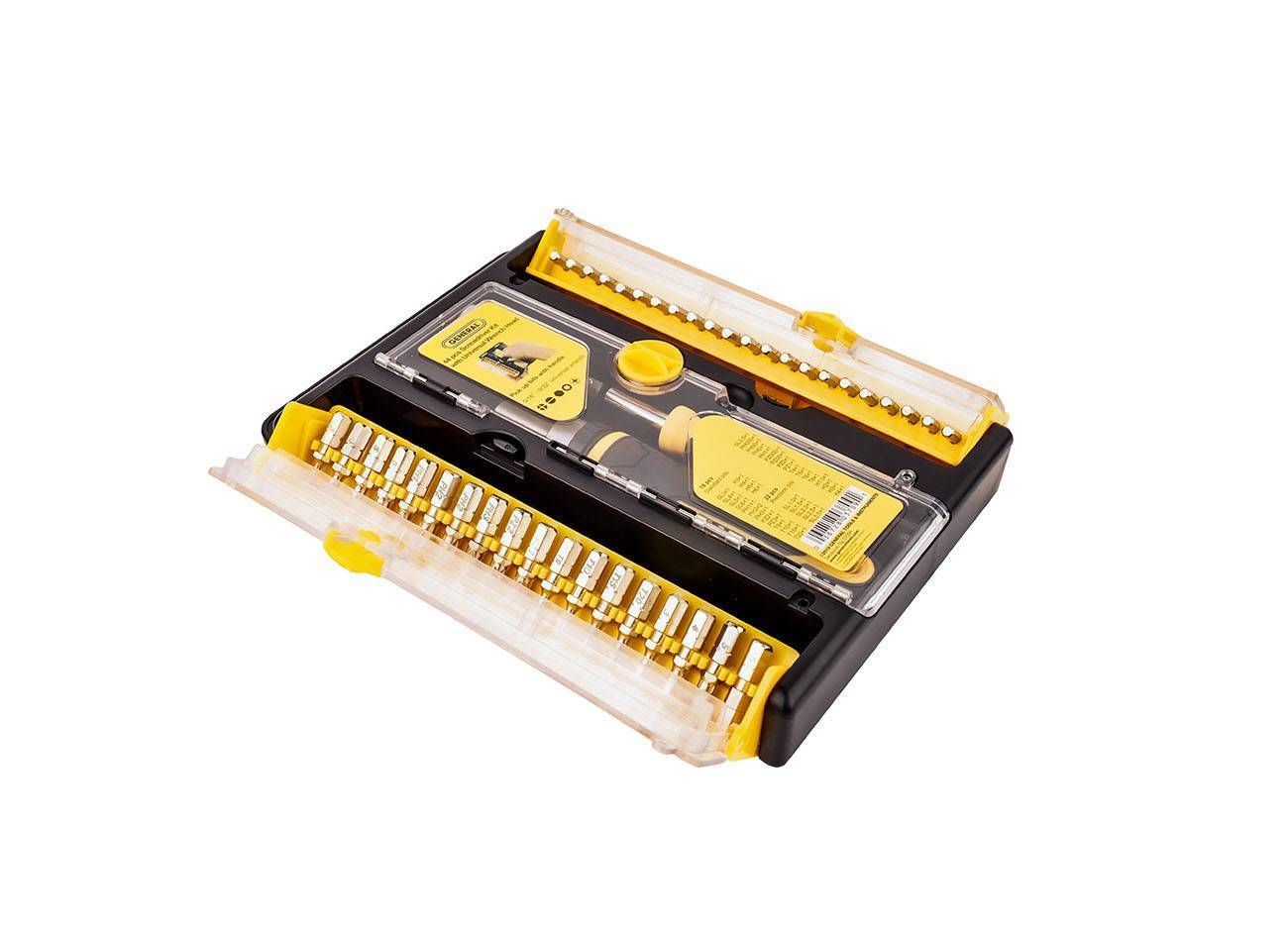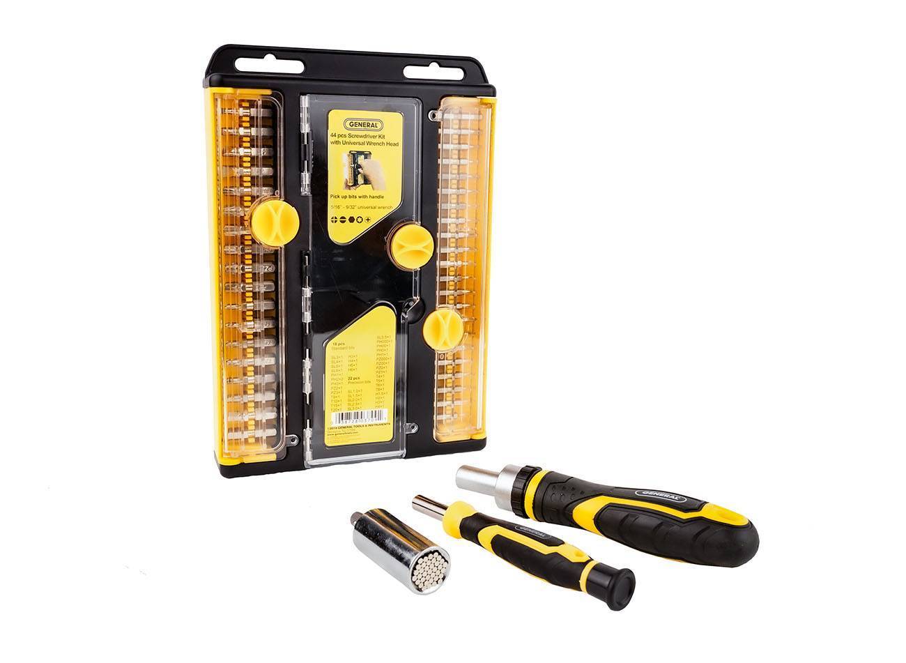 The 44 Pieces Screwdriver Kit with Universal Wrench Head contains different sizes of standard and precision bits. It also contains 1 PC non-slip handle/ratchet handle (59 in), 1 PC non-slip handle (47.6 in) and 1 universal socket head. No screwing project is too big or too small for this product