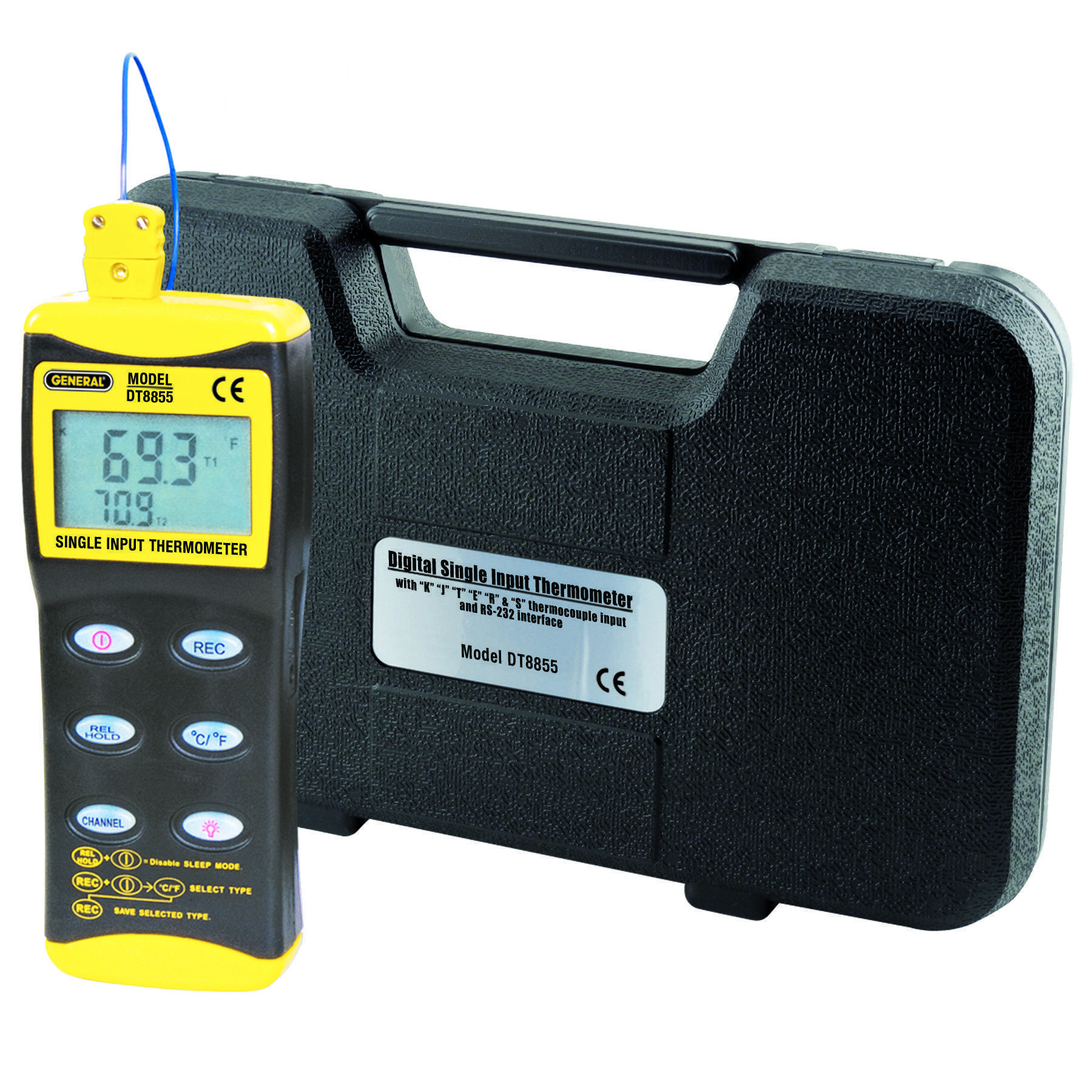 The #DT8855 thermocouple thermometer excels at precision temperature measurement. It includes one Type "K" thermocouple probe. An optional hardware/software kit turns the instrument into a contact temperature data logger.