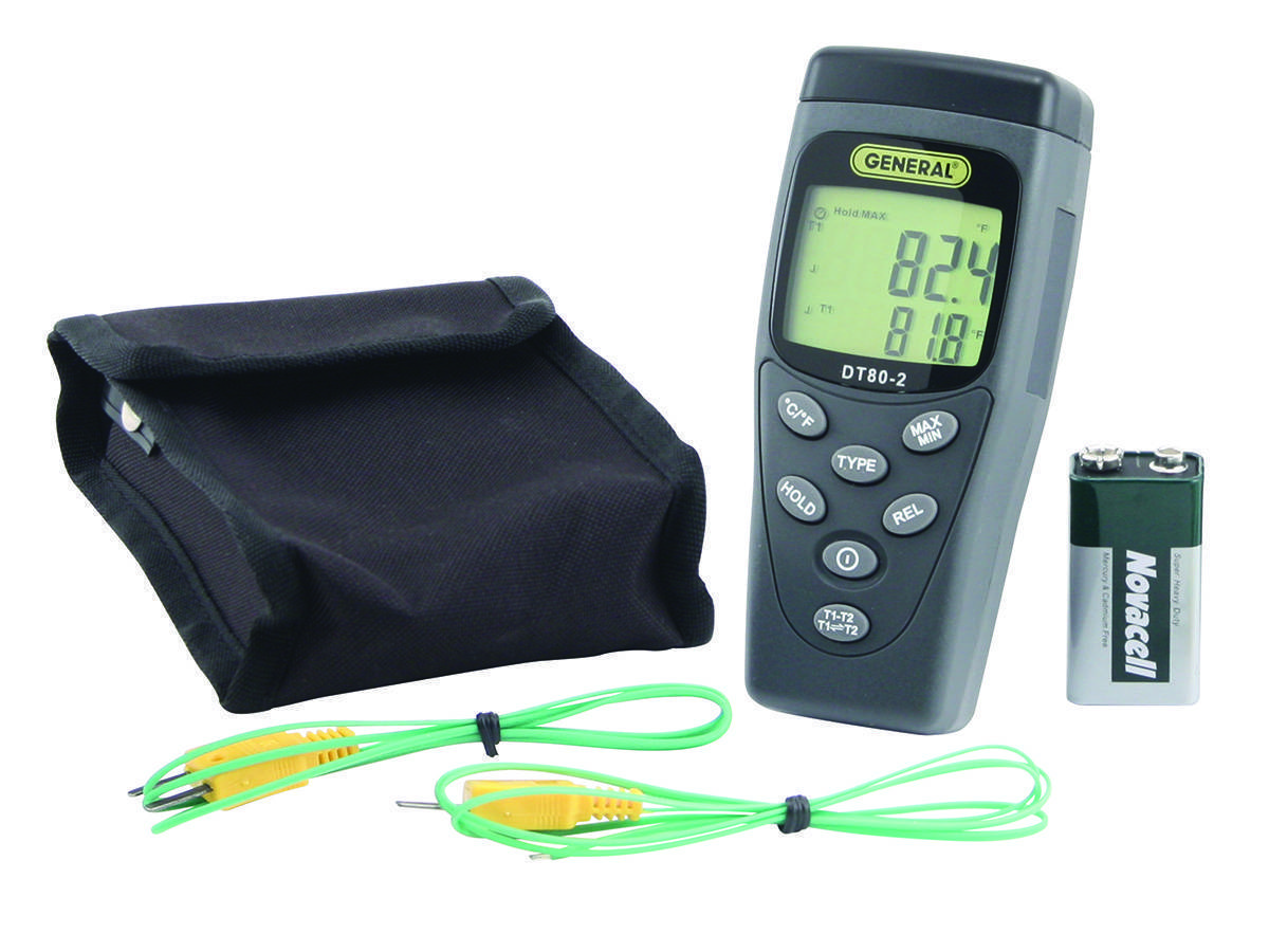 The #DT80-2 Two-Channel Types "K" and "J" Thermocouple Thermometer is ideal for measuring very high or low temperatures in a commercial or industrial environment. It can also measure the difference between channel temperatures T1 - T2.